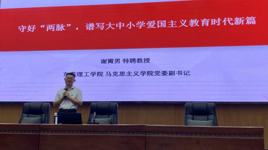 我院党委副书记谢霄男在主题研修活动中作题为《守好“两脉”,谱写大中小学爱国主义教育时代新篇》的专题报告。谢霄男首先介绍了大中小学思政课一体化的由来,然后从守好中国人的“根脉”的重要性、守好中国人的“魂脉”的必要性、守好“两脉”要厚植爱党爱国情怀、守好“两脉”要坚持爱国、爱党、爱社会主义相统一等四个维度对大中小学爱国主义教育一体化的重要性与方法路径展开了深入讲解。