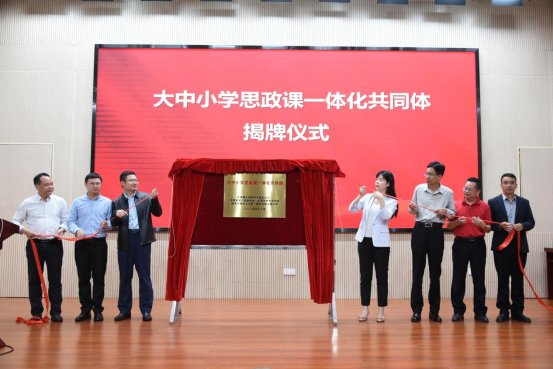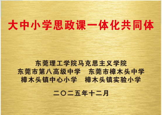 为深入贯彻落实习近平总书记“鼓励各地高校积极开展与中小学思政课共建,共同推动大中小学思政课一体化建设”的重要指示精神,推动思政教育高质量发展,由我院牵头并联合东莞市教育局教研室、东莞市樟木头镇教育管理中心、东莞市第八高级中学、东莞市樟木头中学、樟木头镇中心小学、樟木头镇实验小学共同组建的“东莞市大中小学思政课一体化共同体”正式成立。揭牌仪式于12月2日下午在东莞市第八高级中学隆重举行。