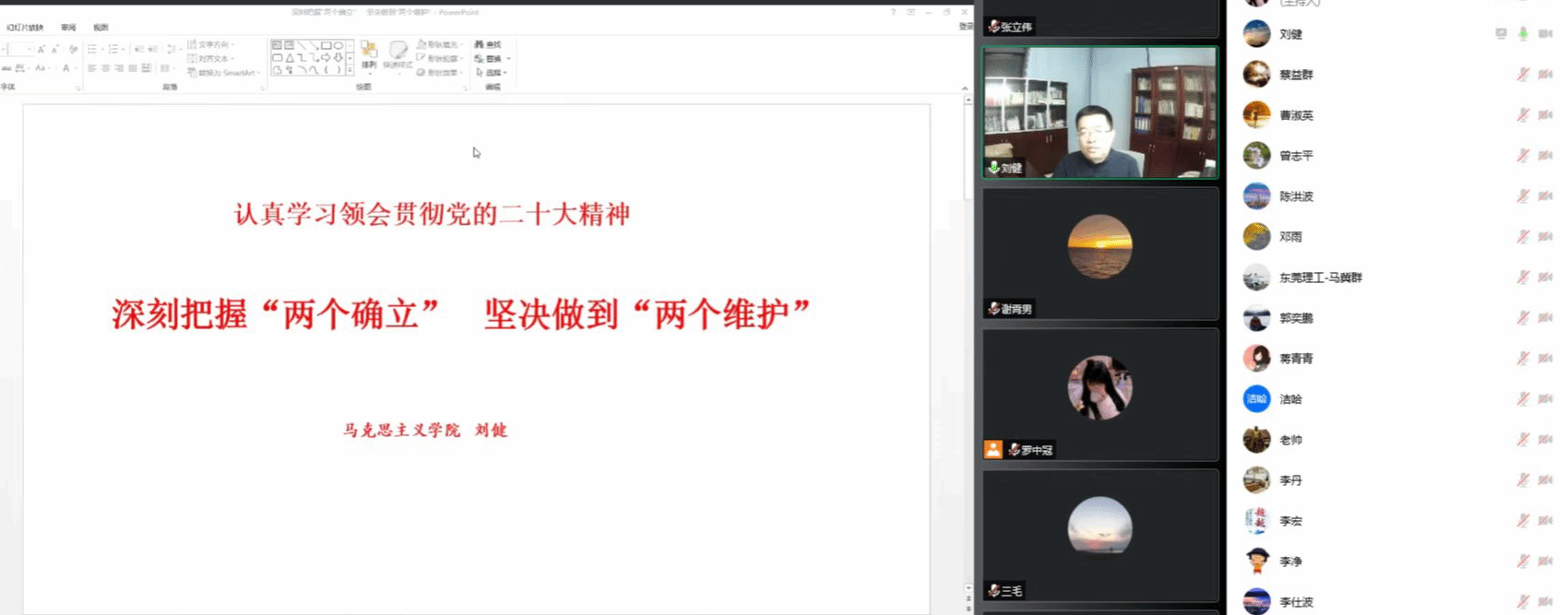 11月30日,yl6809永利集团党委书记、执行院长刘健在线上作党的二十大精神专题辅导报告,报告题为《深刻把握“两个确立”、坚决做到“两个维护”——认真学习宣传贯彻党的二十大精神》。马院全体教职员工参加会议。