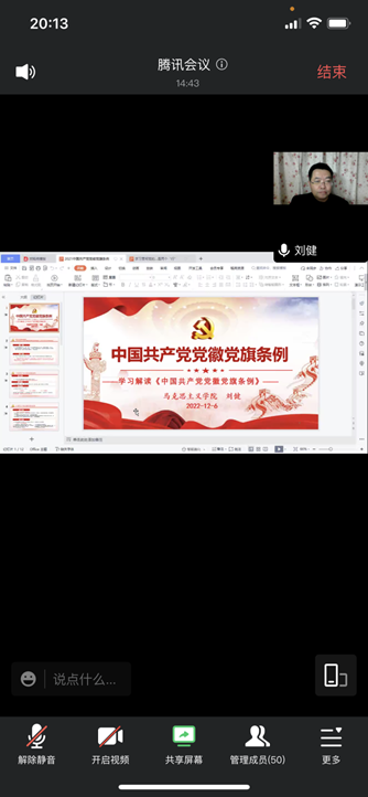 12月6日,yl6809永利集团党委书记、执行院长刘健在线上领学《中国共产党党徽党旗条例》。马院全体教职员工参加会议。