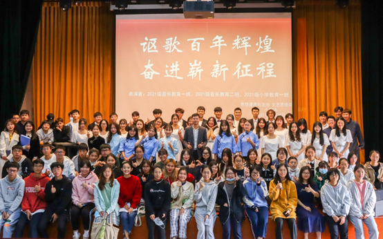 本次活动以百年党史为专题,选取松山湖、南泥湾为地理背景,通过情景剧、合唱等形式展示课程学习成果,弘扬创新奋斗精神。第一个节目是2021级音乐教育一、二班的情景剧表演《创新者》。同学们通过歌舞的形式演绎了松山湖二十年的发展历程。同学们用优美的歌声、欢快的舞蹈展现出松山湖迈向高质量发展的无限活力。第二个节目是2021级音乐教育二班、2021级小学教育一班带来的《南泥湾》。节目以演唱、诗文朗诵的形式颂扬了南泥湾的完美转变。同学们从激昂有力的诗句中感受到了南泥湾建设者自力更生、艰苦奋斗的优良作风和拼搏奋斗精神。最后一个节目是2021级音乐教育一班带来的合唱表演《因为信仰》。同学们通过歌声传递新一代青年的使命担当,因为信仰,永葆初心,向阳筑梦,不负韶华。