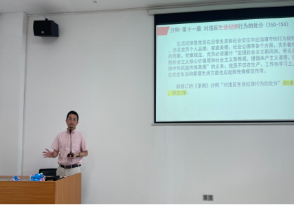 为切实推动《中国共产党纪律处分条例》入脑入心、见行见效,切实开展好党纪学习教育,郭奕鹏副院长在支部会议上以“严明党纪党规,砥砺担当作为”为主题,以“基层干部如何担当作为?”为问题切入点,结合现实案例为支部党员详细解读了《条例》第十章“对违反工作纪律行为的处分”和第十一章“对违反生活纪律行为的处分”的具体内容。郭奕鹏指出,党员同志要结合习近平总书记关于严明党的纪律和规矩的重要论述并进行深入学习,从党和国家发展大局看《条例》,把握《条例》内在精神和要求,以实践智慧把握《条例》具体内容。