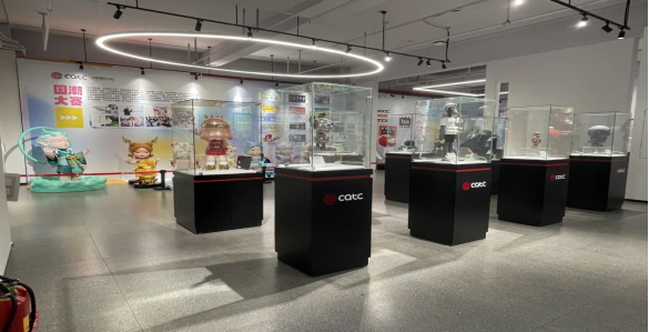 潮玩展厅陈列着数种中小型手办及周边产品,从广东科技学院获奖的参赛作品到东莞市知名玩具企业的玩偶,再到风靡全球的泡泡玛特爆款盲盒ip。