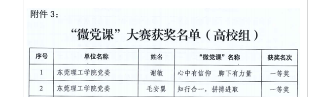 近日,东莞市委教育工委公布优秀主题党日等评选活动获奖名单,我院参赛作品在高校组中斩获佳绩。其中,获得党建工作创新案例一等奖1项和“微党课”大赛一等奖2项。